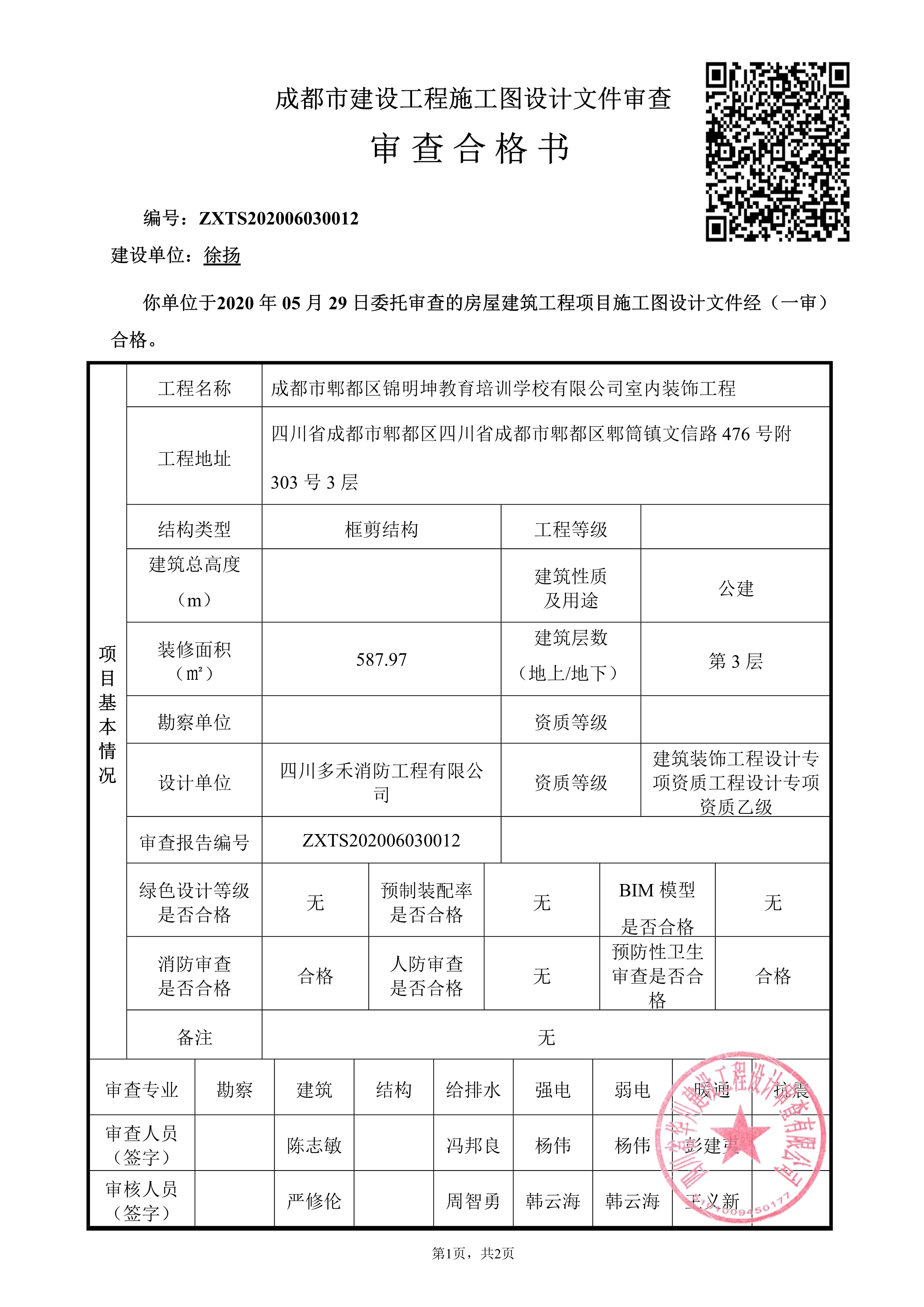 本公司2020年05月设计的成都市郫都区锦明坤教育培训学校有限公司内部装饰工程项目,经图审机构审查合格!